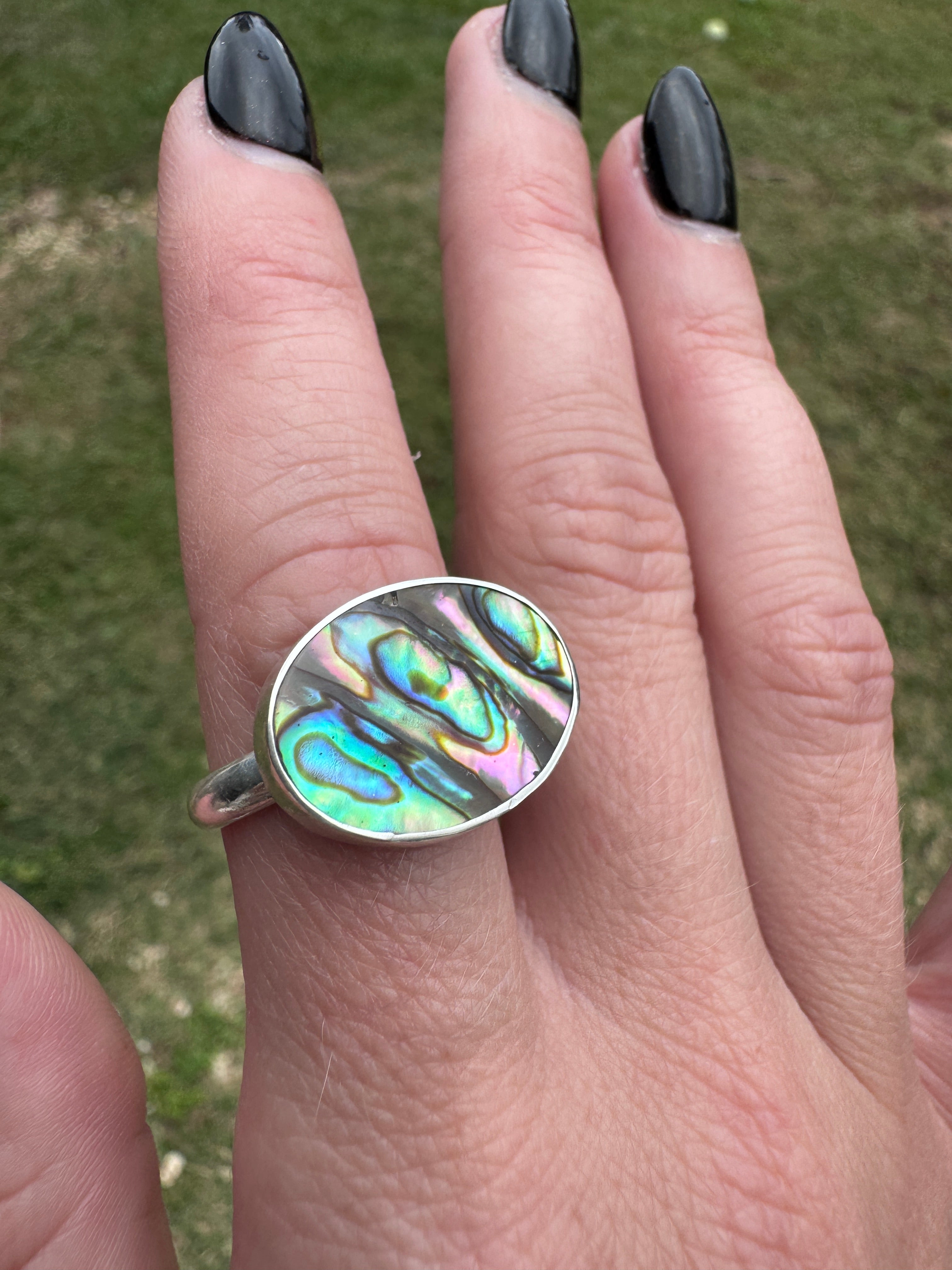 Handcrafted from sterling silver, this ring features a unique abalone shell that captures the shifting hues of blue and green. Each piece is distinct, embodying the serene essence of the ocean. Designed to evoke calm and connection to the sea, it offers a timeless elegance to wear every day.